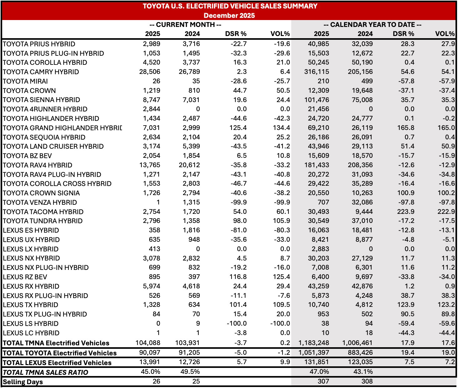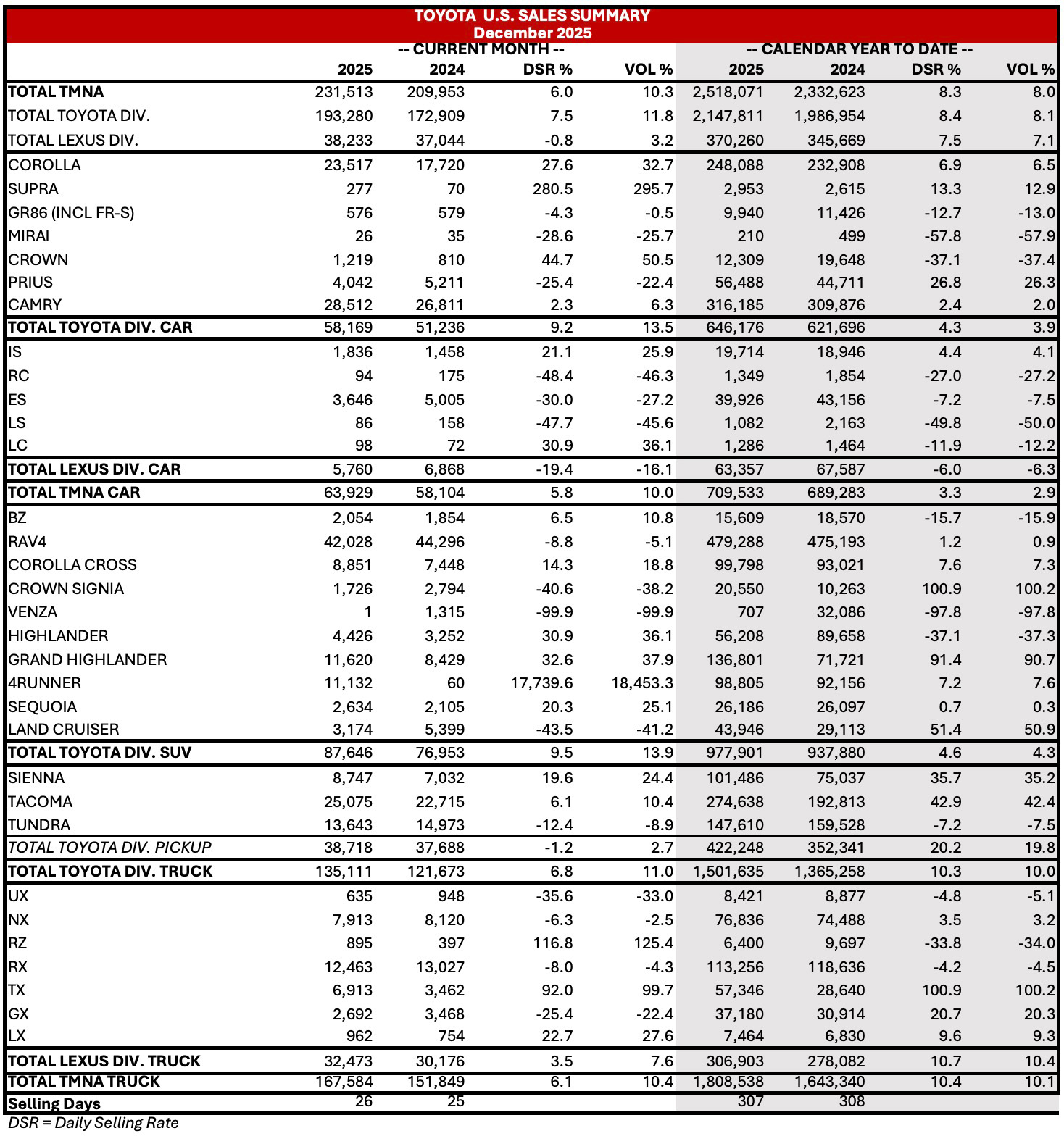 Lexus sold an additional 28,706 TX's this year over last year. Subtract that amount from the 2025 annual Lexus sales (370,260) and you end up with 341,554 vehicles sold - less than last year's 345,669 sold.